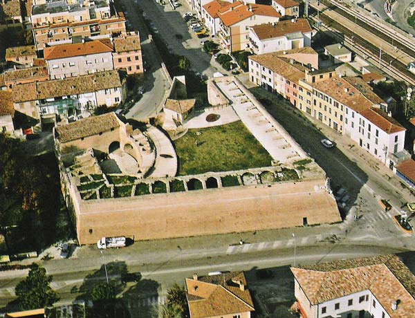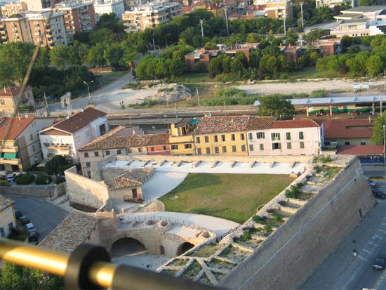 Bastione Sangallo a Fano: cortile della piazza bassa a monte visto dall'ingresso, con gli archi del loggiato, agosto 2007