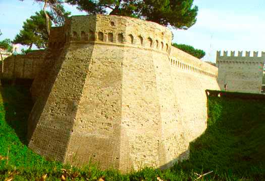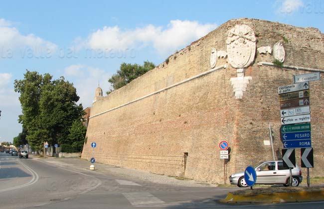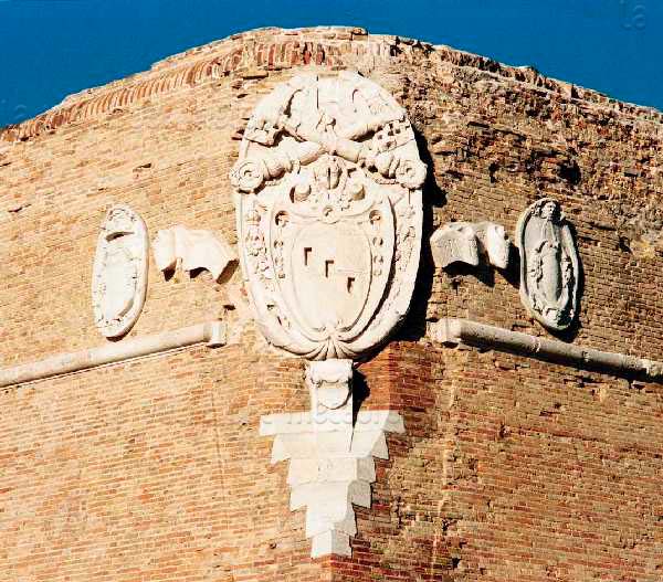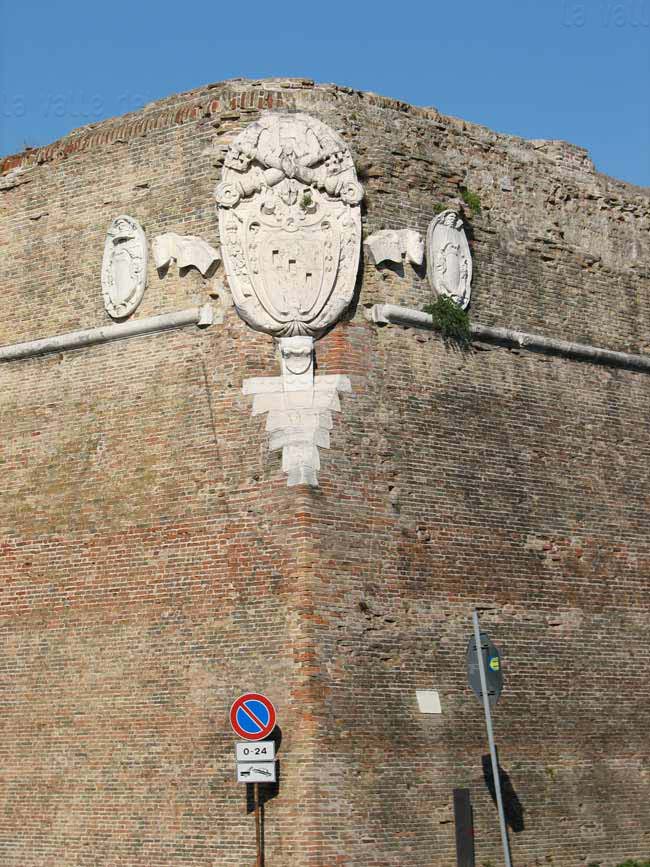 Bastione Sangallo a Fano: cuspide della fortificazione rivolta ad Est, con stemma papale, agosto 2007