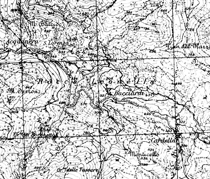Rocca Leonella, Acquanera, Bacciardi e Cardella sul M. Nerone (Comune di Piobbico). Carta IGM 1:25.000 116 IV S.O. (autorizz. IGM n. 4877 del 2-11-1998)