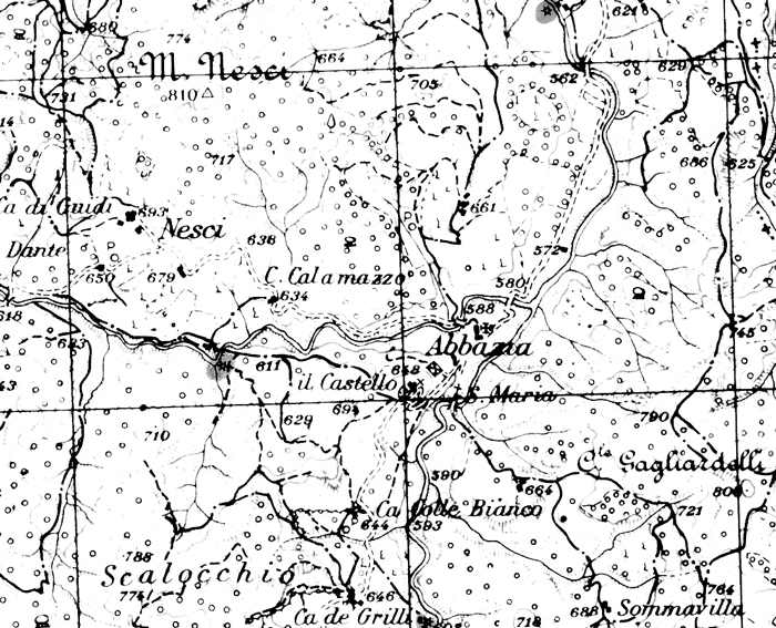 Abbazia di Scalocchio (Città di Castello). Carta IGM 1:25.000 115 I N.E. (autorizz. IGM n. 4877 del 2-11-1998)