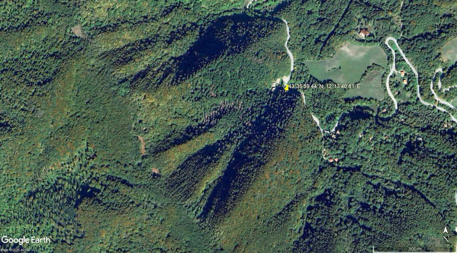Abetina di Fonte abeti (da: Google Earth, ripresa del 9 ottobre 2023). Si vedono numerosi abeti secchi