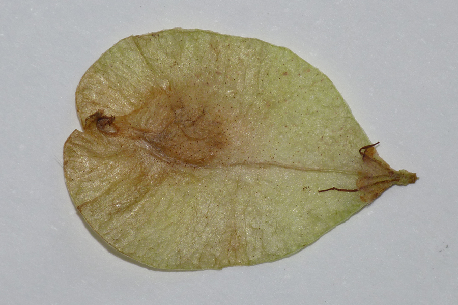 Samara di Ulmus minor di 20 mm, area verde del Centro di educazione ambientale Casa Archilei a Fano, metà aprile 2025. Il seme è eccentrico rispetto all'ala che lo circonda