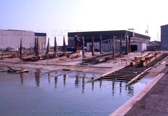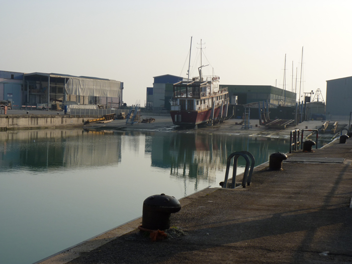 Scalo di alaggio nel bacino di levante del Porto di Fano, gennaio 2012. La barca sullo scalo è stata adattata a ristorante
