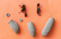 Sceliphron curvatum, giugno 2005. Accanto le sue celle di fango con relativo opercolo che le chiudeva, costruite dentro casa attaccate dietro un quadro (Collezione L. Poggiani)