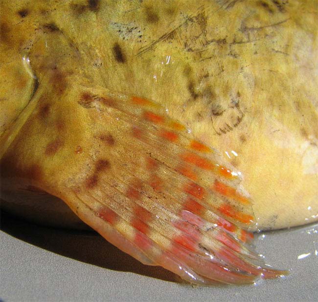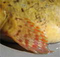 Bavosa sanguigna di 13 cm, particolare della pinna pettorale. Scogliere di Fano, luglio 2006