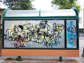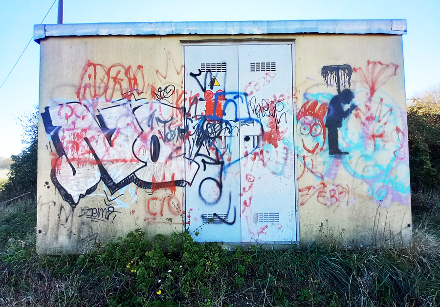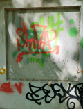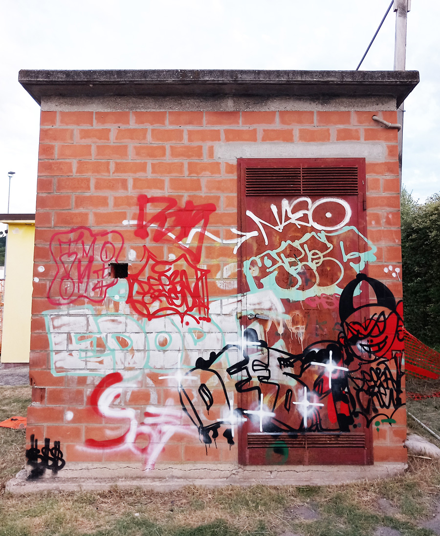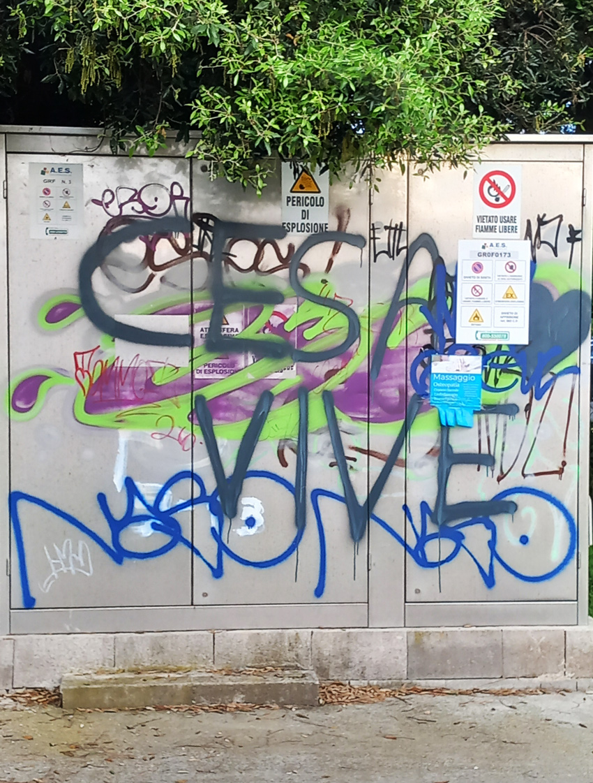 Scritte e ghirigori con lo spray su una cabina del gas il Via Aldo Moro a Fano, maggio 2025, sovrapposte a quelle del 2022. La scritta "CESA vive" si riferisce ad un giovane operaio morto sul lavoro poco tempo prima