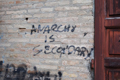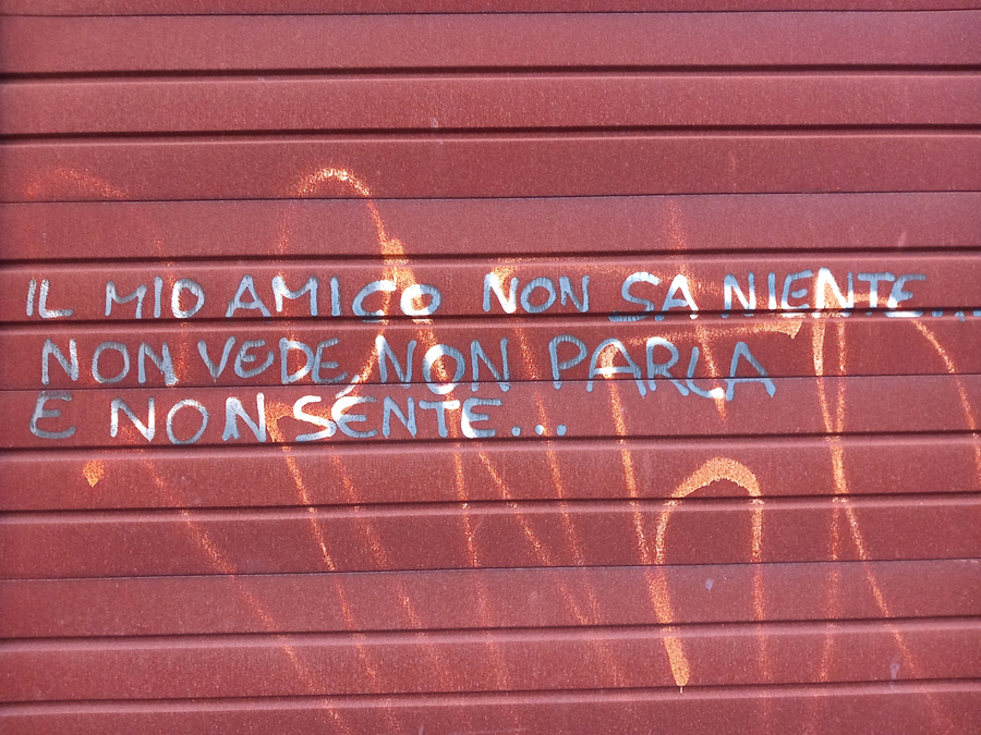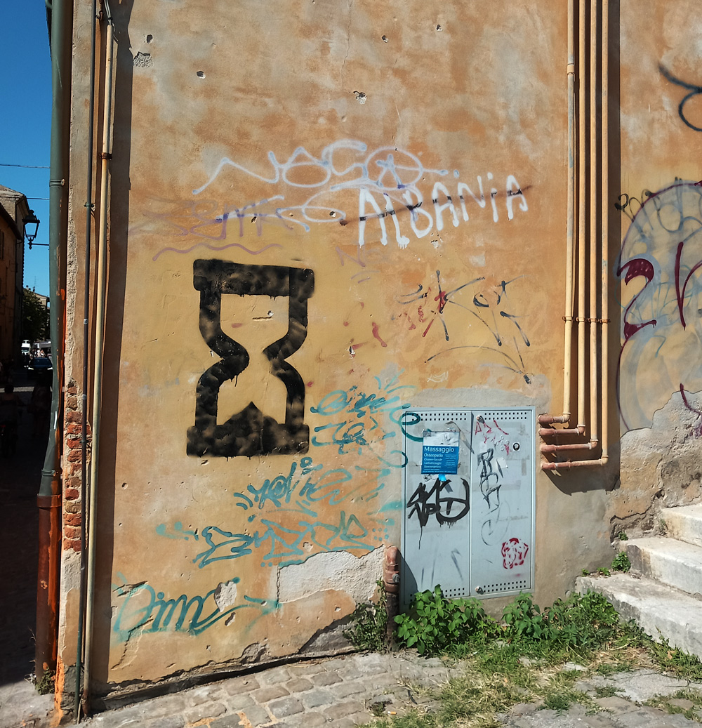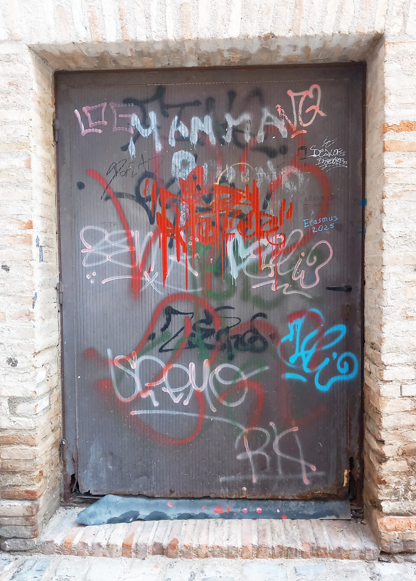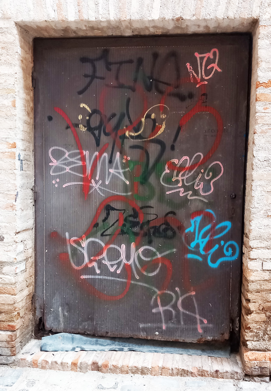 Scritte sovrapposte su una porticina del centro storico di Fano, dicembre 2023