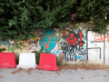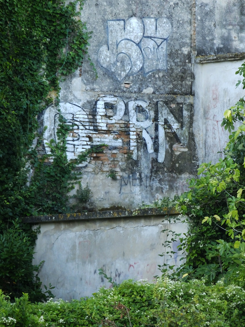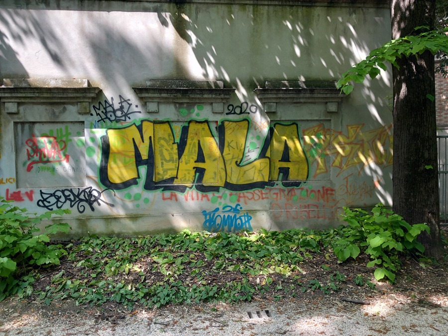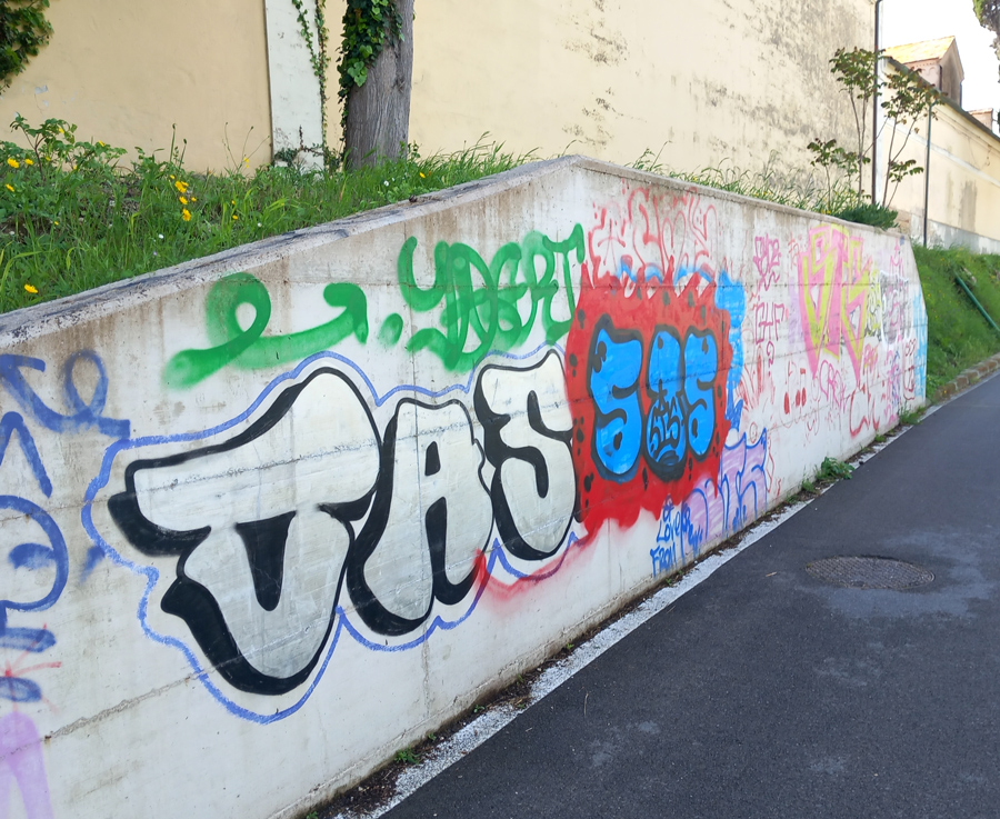 Scritte in stile graffiti lettering su un muretto in Via della Giustizia presso il Cimitero urbano, aprile 2025