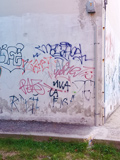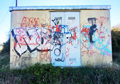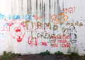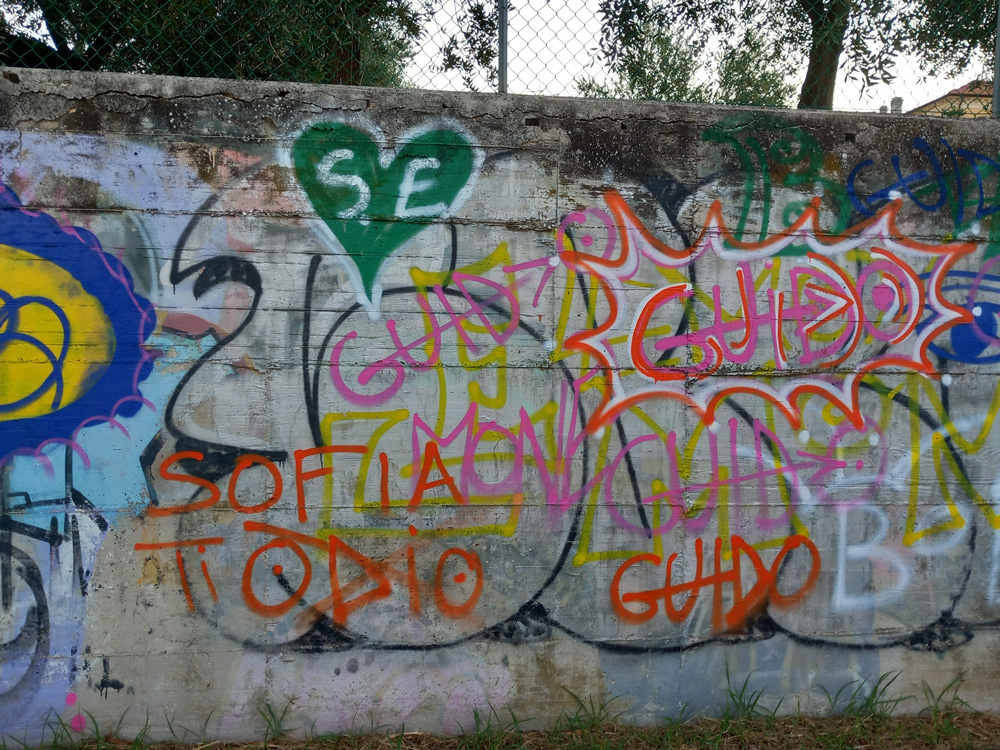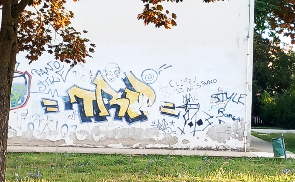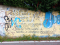 Scritte in parte sovrapposte su un muro lungo la pista ciclistica della Trave a Fano, dicembre 2022