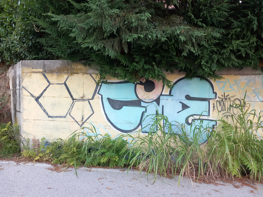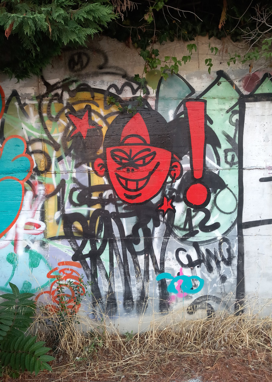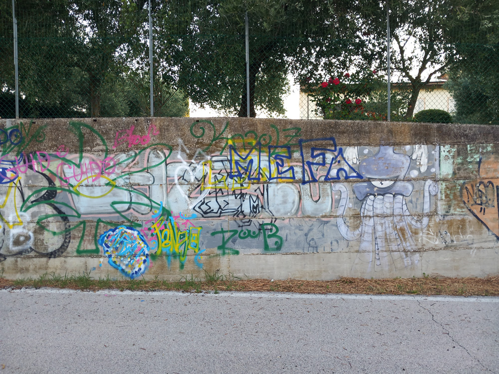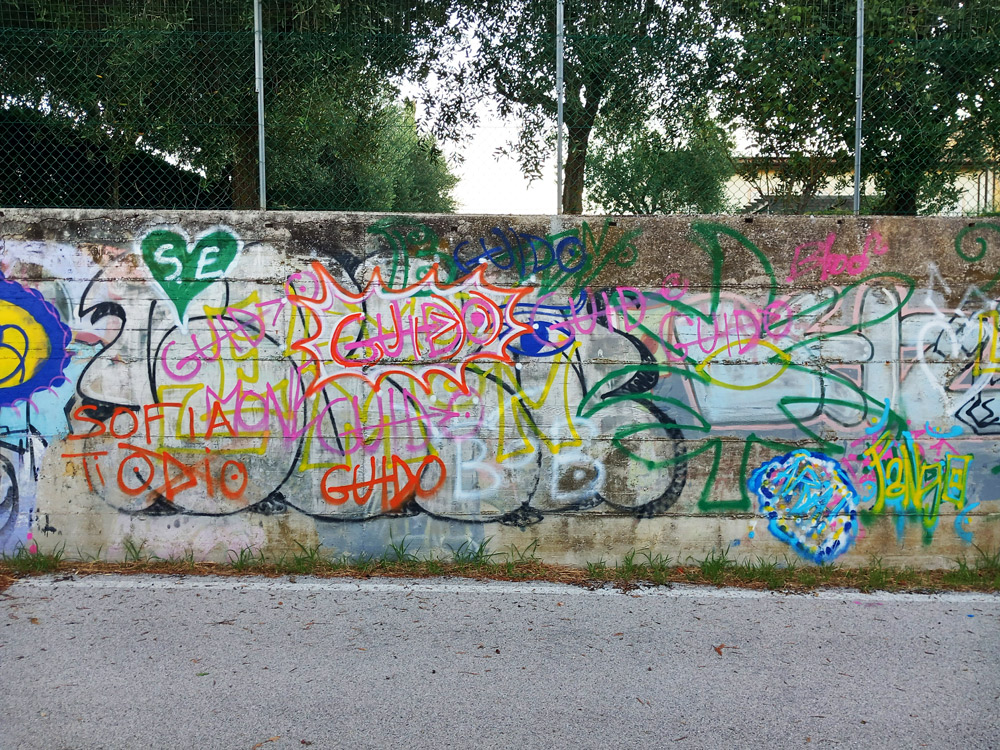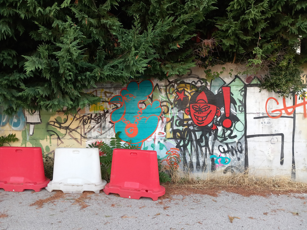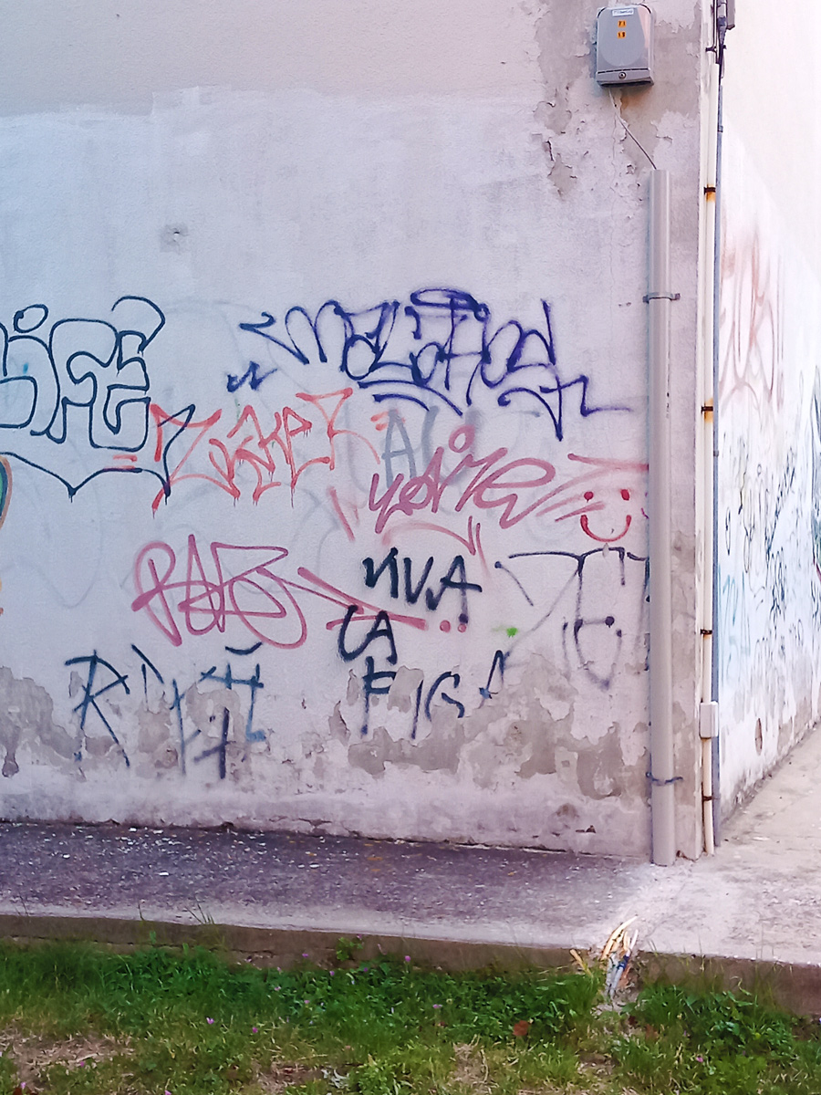 Scritte e disegni su un muro lungo la pista ciclistica della Trave a Fano, luglio 2025
