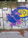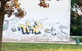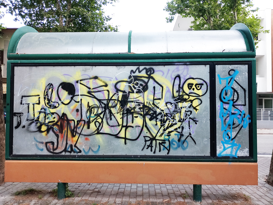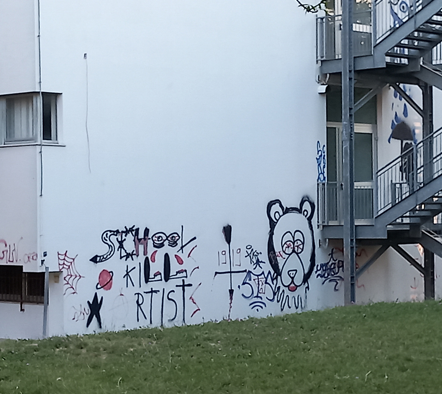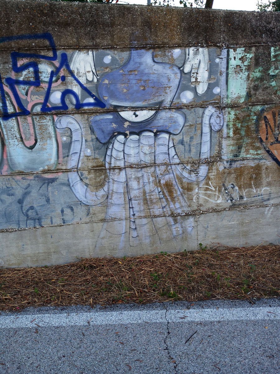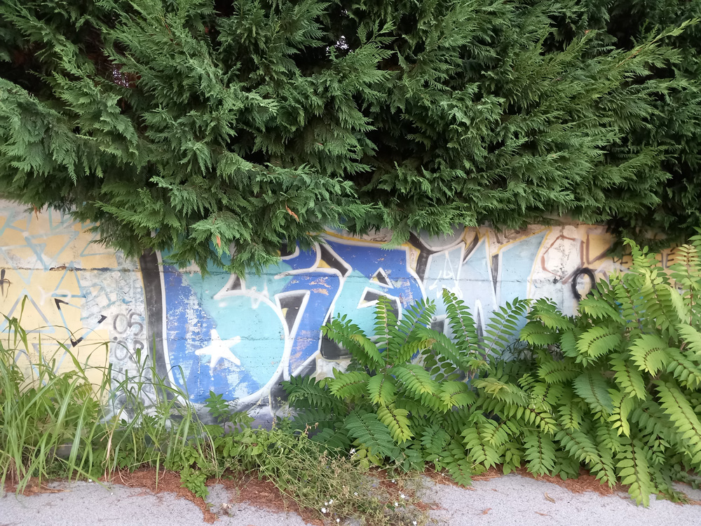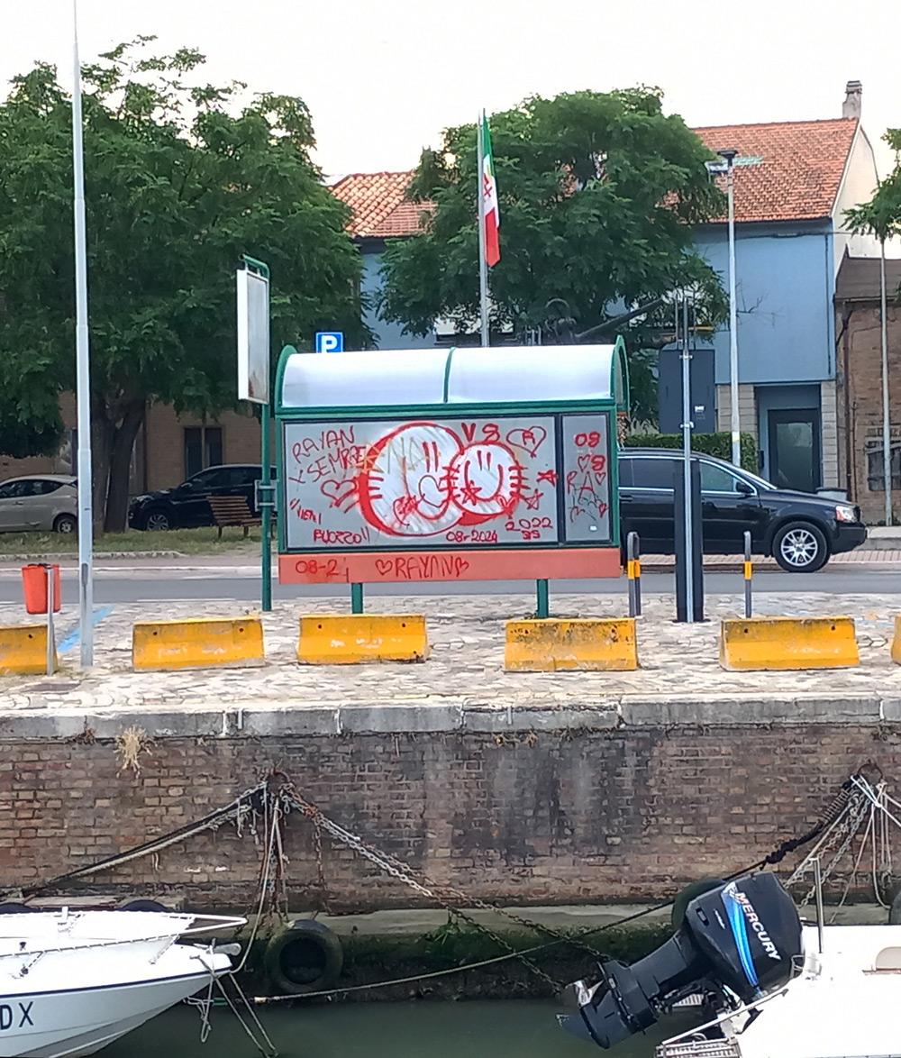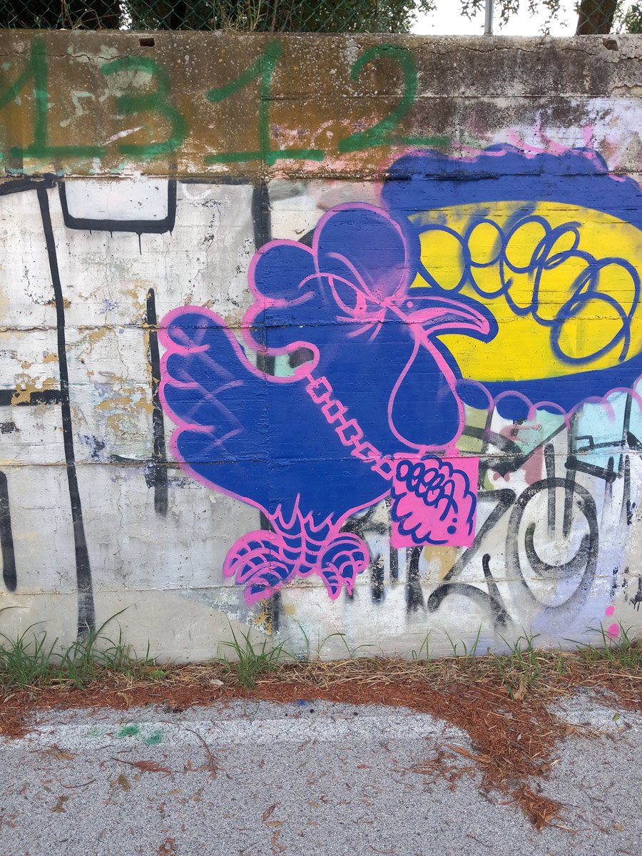 Scritte e disegni su un muro lungo la pista ciclistica della Trave a Fano, luglio 2025