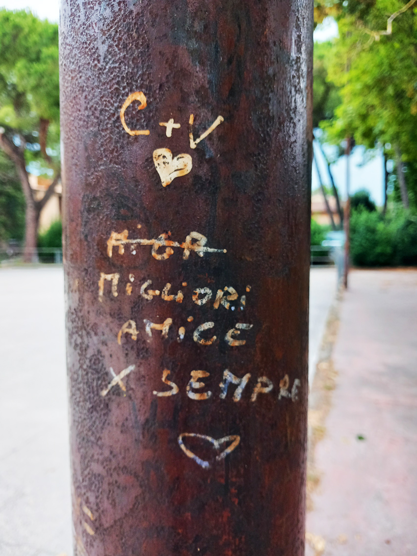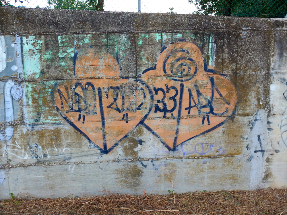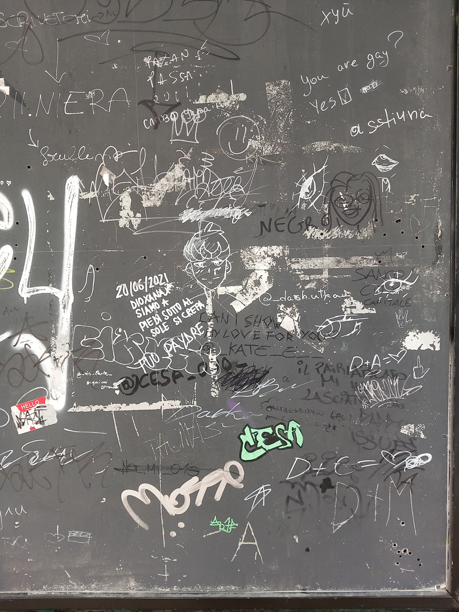 Scritte e disegni sul muro di recinzione del Seminario di Fano, gennaio 2024. In chiaro e frettolose la classica “ti amo vita mia” con aggiunta di cuori, e “Alienazione di massa post covid”