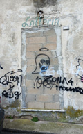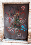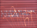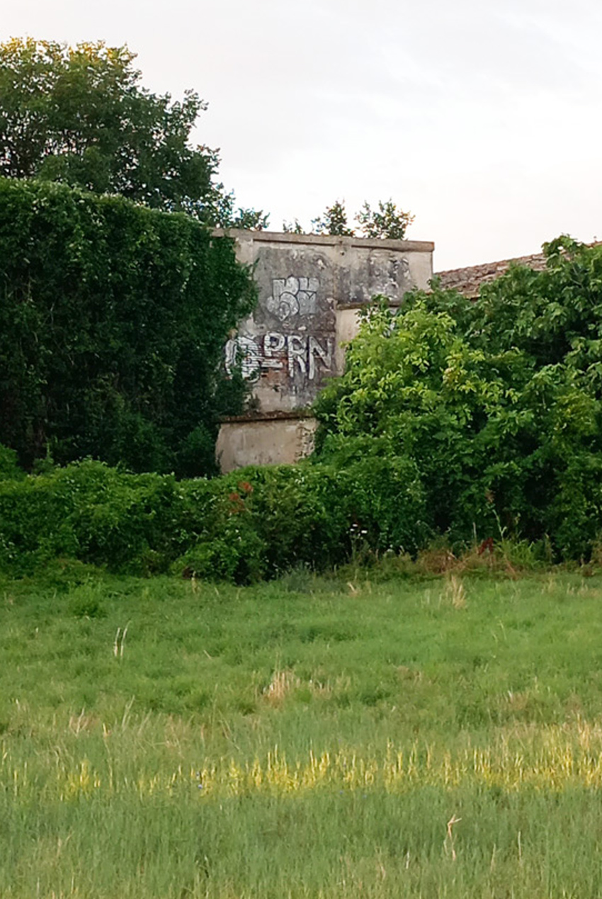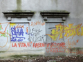 Scritte su un edificio abbandonato alla Liscia, dicembre 2023. Si intravede la scritta fatta a mano e assai scolorita "Latteria" sopra l‘uscio tamponato e sovrapposte varie scritte a spray. Questa casa oggi in abbandono aveva la stalla con qualche mucca e un pezzo di terra coltivata adiacente al cimitero urbano, e negli anni ’50 e ’60 del secolo scorso la famiglia che l'aveva in affitto vendeva il latte prodotto. In quegli anni la lattarola passava lungo le vie di Fano coi bidoncini del latte in alluminio da vendere sfuso