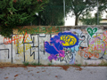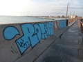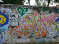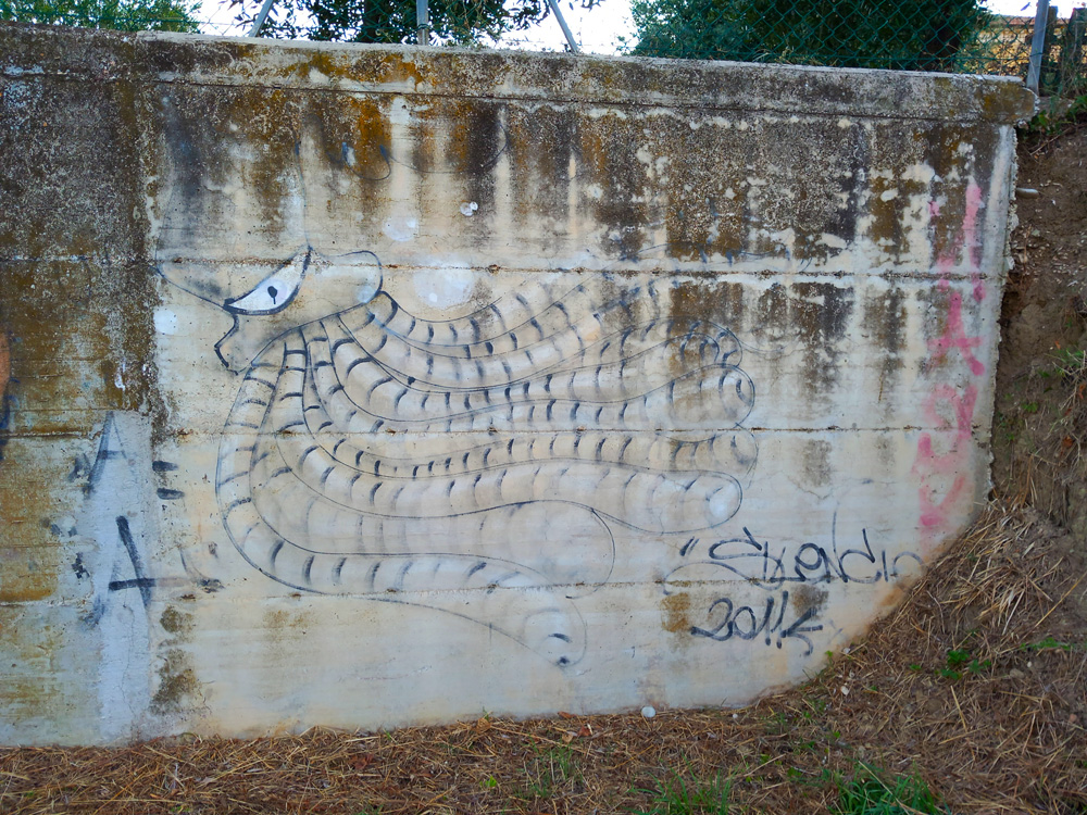 Scritte e disegni su un muro lungo la pista ciclistica della Trave a Fano, luglio 2025. In basso a destra si intravede quella che sembra una firma (Silencio) e la data 2011