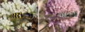 Bembix oculata, a sx: femmina su Echinophora spinosa e a dx: maschio su Sixalix atropurpurea, spiaggia di Baia del Re a Fano, agosto 2021 (foto G. Olivieri)
