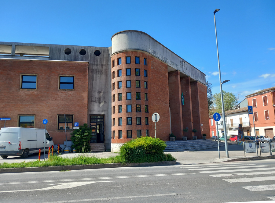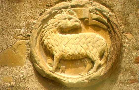 Scultura dell'Agnello di Dio con bandiera nella facciata della Pieve dei Santi Pietro e Paolo a Cartoceto, luglio 1988