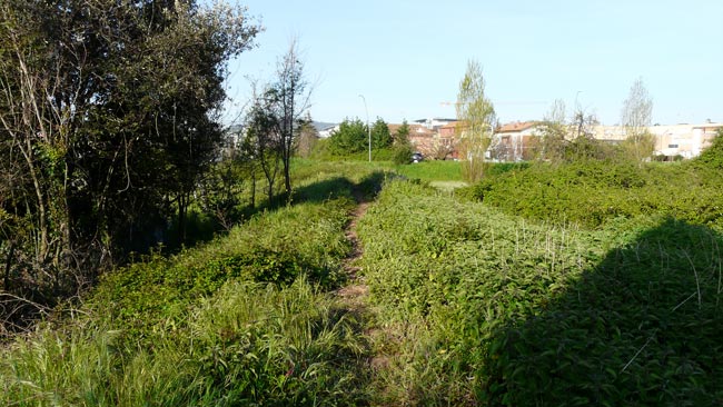 Se viene contenuta la vegetazione spontanea, i binari sono utilizzati come percorso pedonale; Fano, tra i quartieri Vallato e S. Orso, aprile 2015