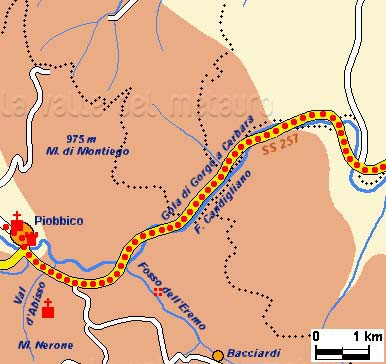 Seconda parte dell'itinerario lungo il Torrente Biscubio da Piobbico alla Foresta di Bocca Serriola (legenda della carta in scheda introduttiva agli itinerari)