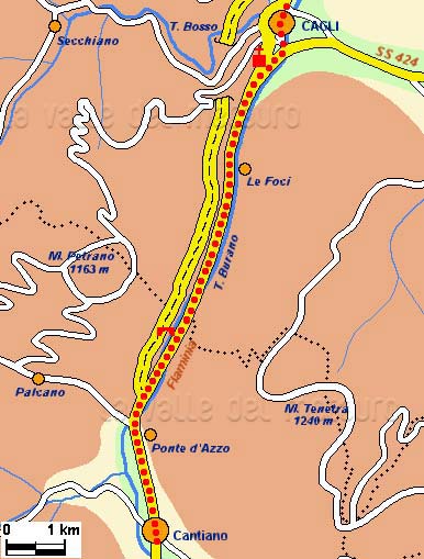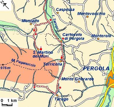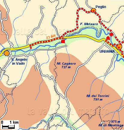 Seconda parte dell'itinerario lungo il Torrente Candigliano da Acqualagna a San Martino del Piano (legenda della carta in scheda introduttiva agli itinerari)