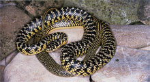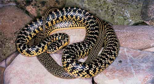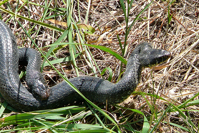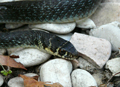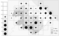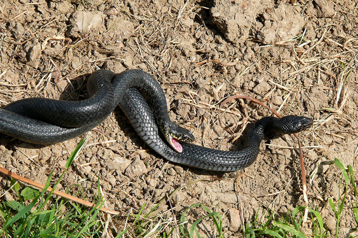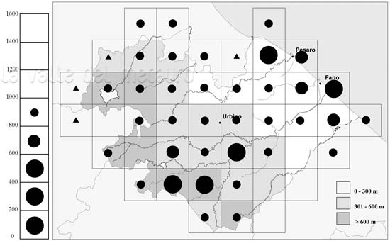 Biacco - Carta di distribuzione in Provincia di Pesaro e Urbino, 2002. Legenda: cerchio grande = 7 e più rilevazioni dal 1980; cerchio medio = 4-6 rilevazioni; cerchio piccolo = 1-3 rilevazioni; quadrato = dato anteriore al 1980; triangolo = dato fuori dei confini della Provincia. Nel grafico altitudinale: cerchio grande = 15 e più rilevazioni; cerchio medio = 5-14 rilevazioni; cerchio piccolo = 1-4 rilevazioni. Ulteriori notizie nella scheda: Come leggere le schede dei Rettili