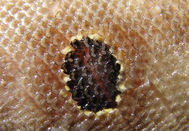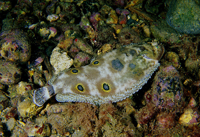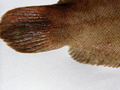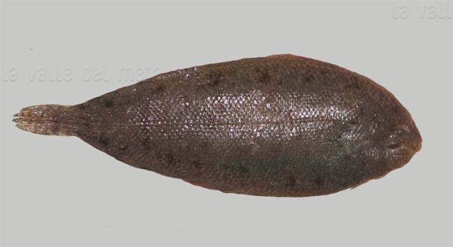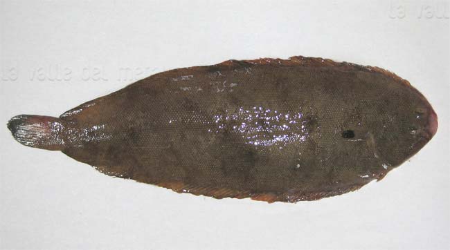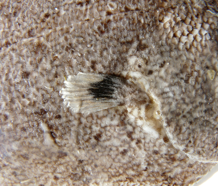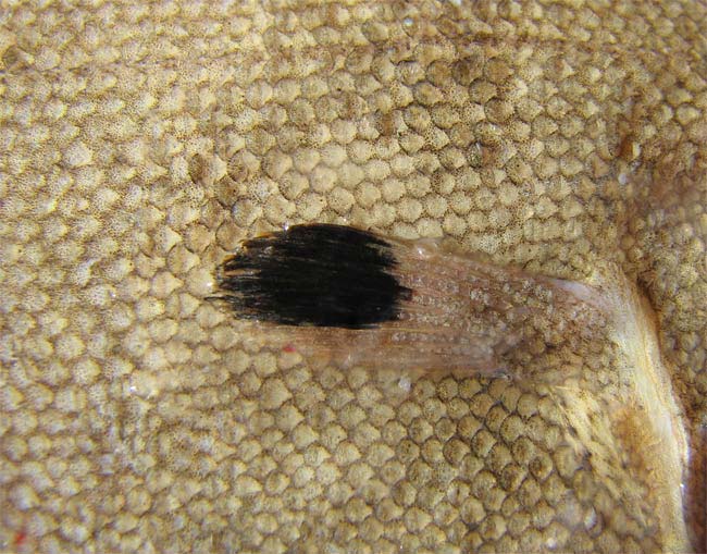 Sogliola occhiuta di 11,5 cm, particolare della macchia ocellare. Pescherie di Fano, giugno 2006