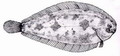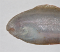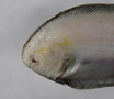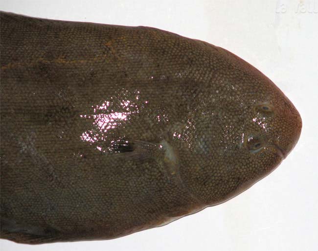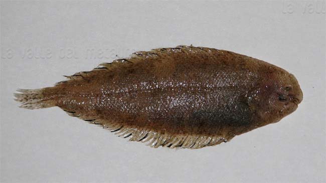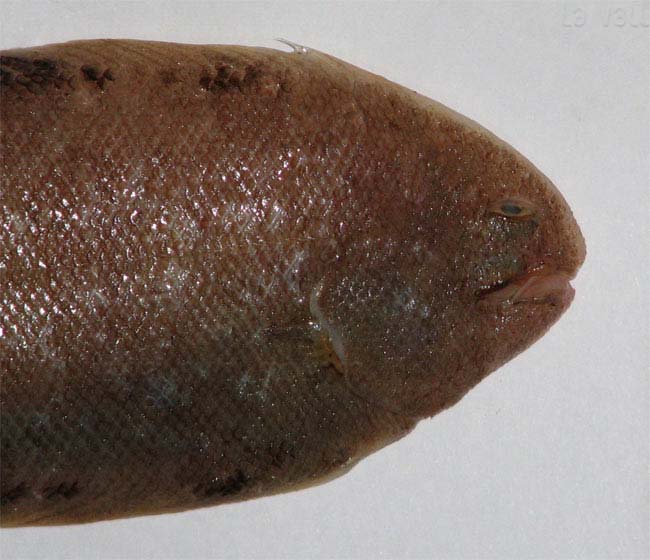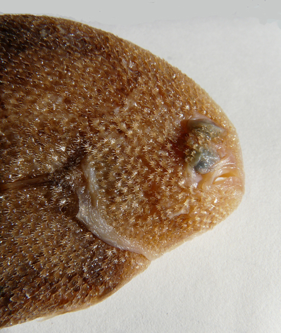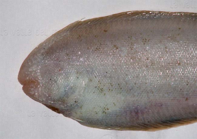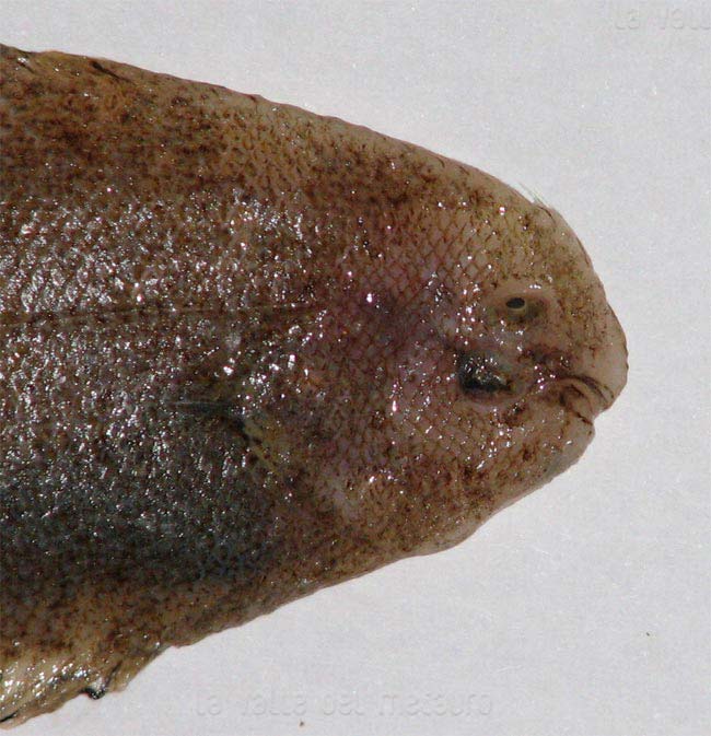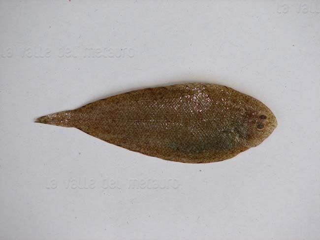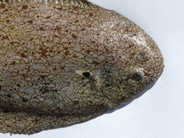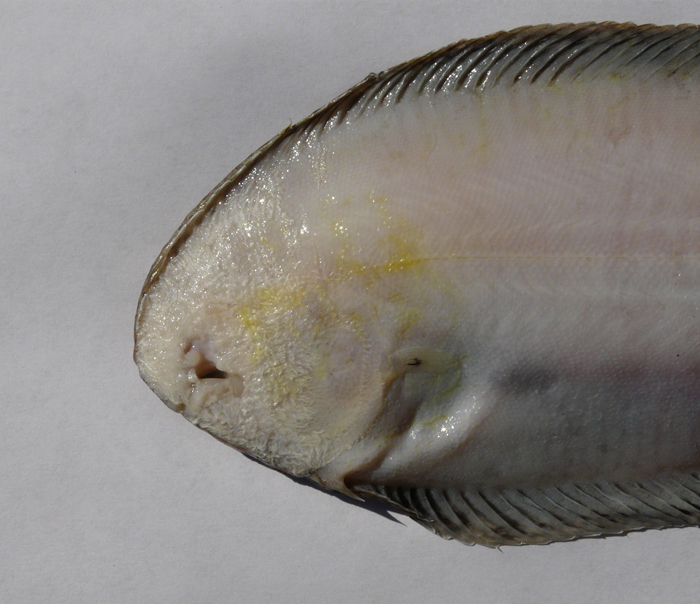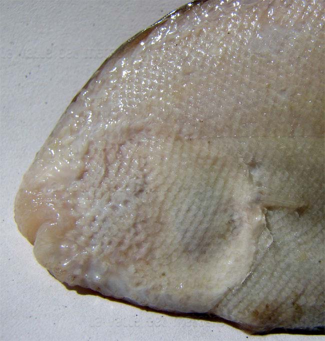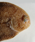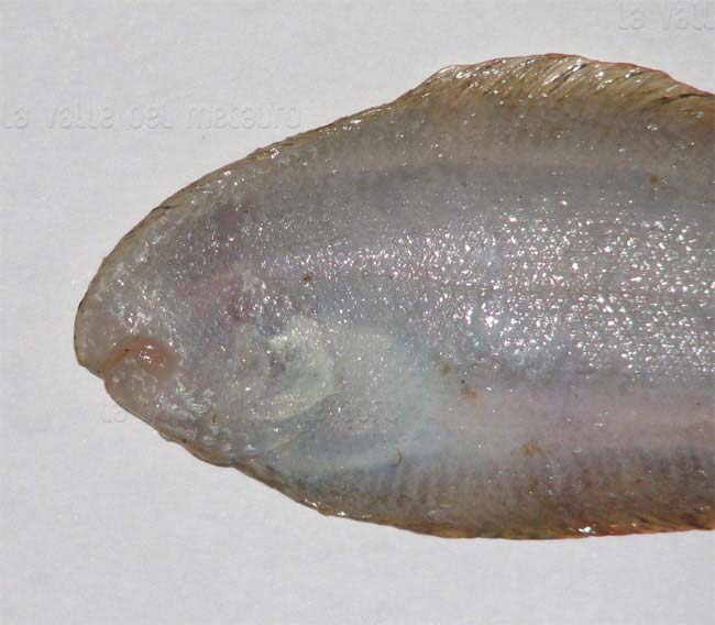 Sogliola occhiuta di 11,5 cm, particolare della testa dal lato cieco. Pescherie di Fano, giugno 2006