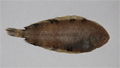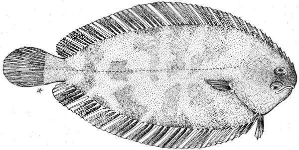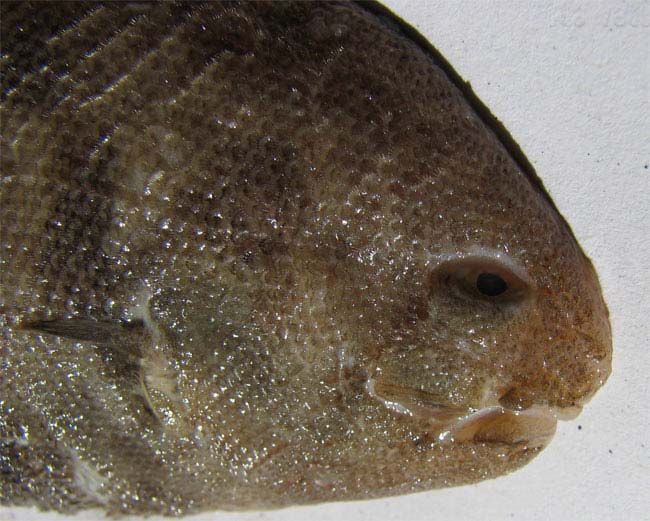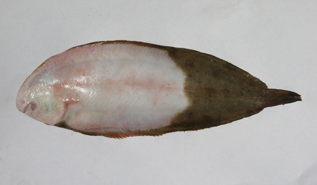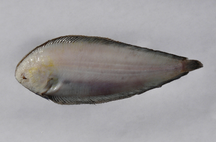 Sogliola fasciata di 14 cm, particolare della testa dal lato cieco. Pescherie di Fano, giugno 2006
