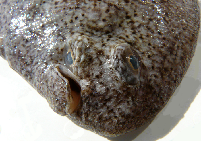 Sogliola gialla, particolare della testa dal lato cieco. Pescherie di Fano, maggio 2006