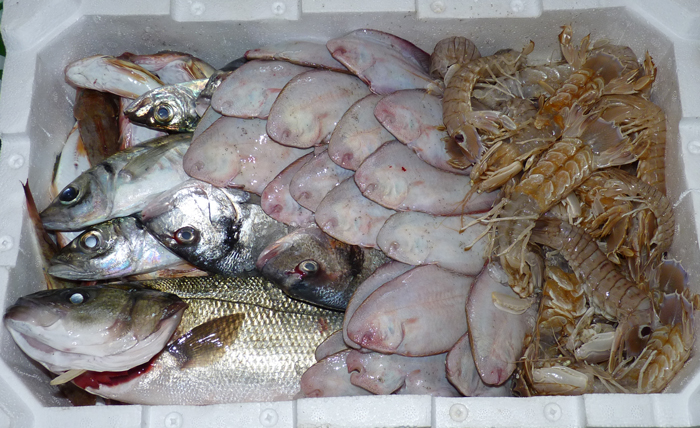 Sogliole, orate, suri, spigola e canocchie pronte per la vendita, luglio 2010