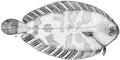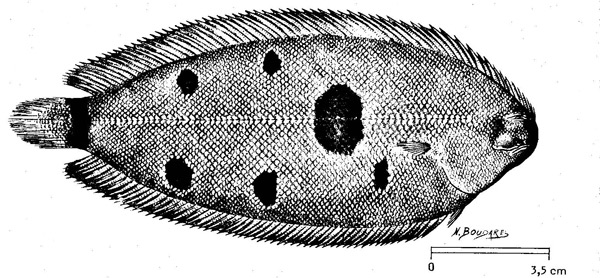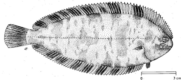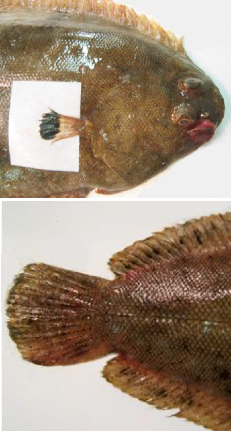Sogliola egiziana. In alto: testa ed evidenziata la pinna pettorale; in basso: pinne dorsale ed anale verso l'estremità caudale (da: BULLO et al., 2012)