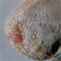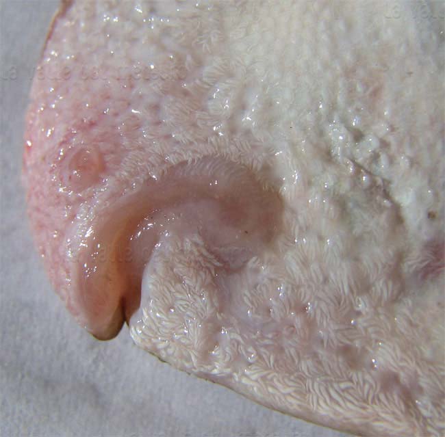 Sogliola di 21 cm, particolare della testa dal lato cieco, con visibili i villi sensoriali. Pescherie di Fano, giugno 2006