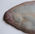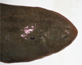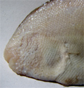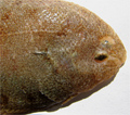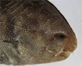 Sogliola fasciata, particolare della testa dal lato cieco. Pescherie di Fano, maggio 2006