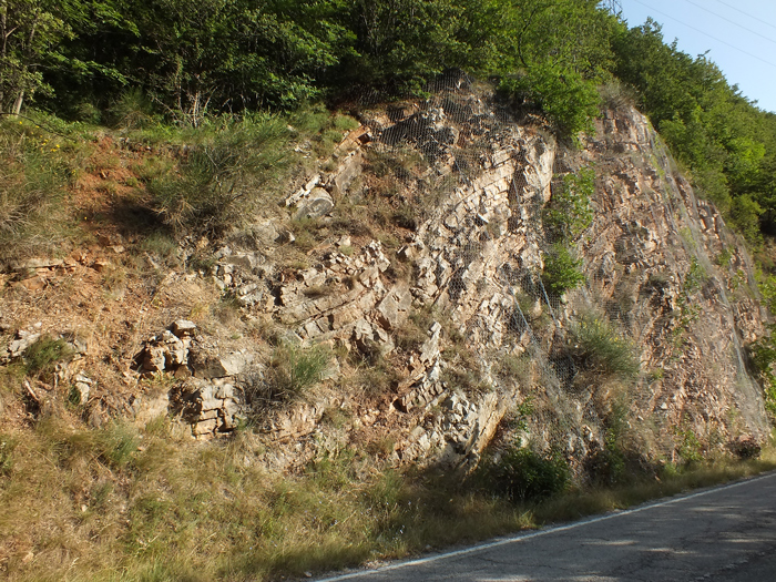 Sommità della Formazione della Corniola con strati rossicci, al passaggio con la sovrastante formazione del Rosso Ammonitico (localmente degradata, v. terriccio rosso alla sommità di sinistra della scarpata); Gola del Bosso poco a monte della loc. Eremita, luglio 2012