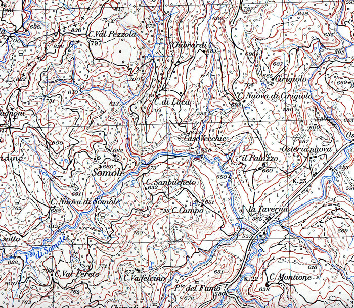Somole, la Taverna e Osteria nuova, Comune di Apecchio. Carta IGM 1:25.000 115 I S.E., rilievo 1952 (autorizz. IGM n. 4877 del 2-11-1998)