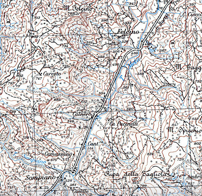 Sompiano, Calnero e Felcino in Comune di Borgo Pace. Carta IGM 1:25.000 115 I N.O., rilevam. 1952 (autorizz. IGM n. 4877 del 2-11-1998)