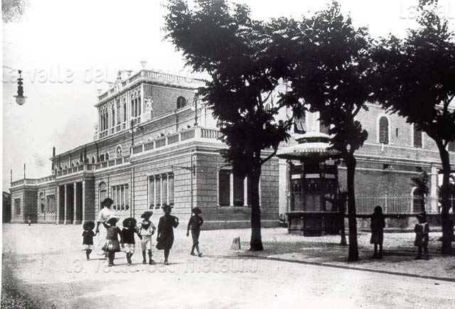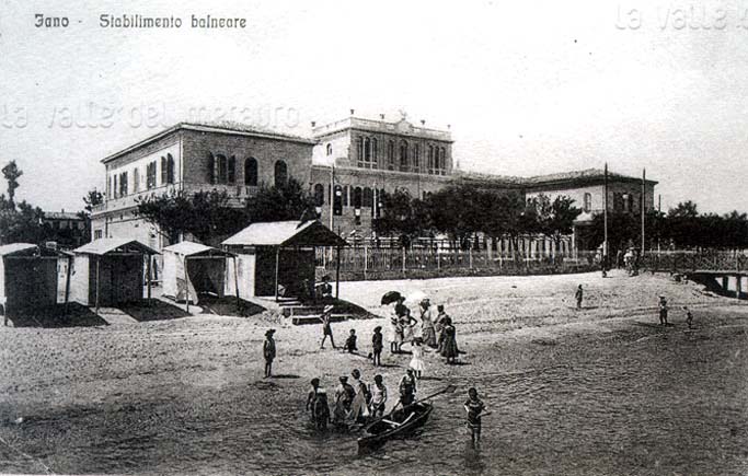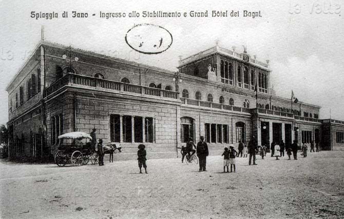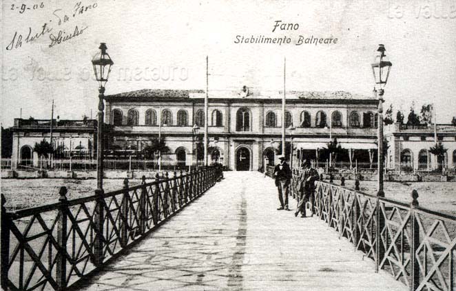 Stabilimento e Grand Hotel dei Bagni di Fano, primi del 1900. Dopo essere stato rifatto nel 1914 e nel 1940, l'edificio venne definitivamente demolito nel 1964 (cartolina d'epoca)