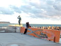 Statua del Lisippo (copia) e murale lungo la Passeggiata omonima nel Porto di Fano, agosto 2025