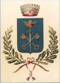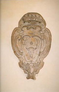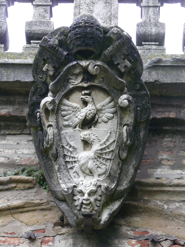 Stemma del Papa Paolo V sul loggiato tamponato della Darsena Borghese di Fano, gennaio 2010
