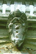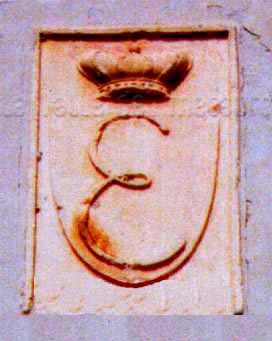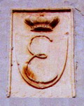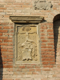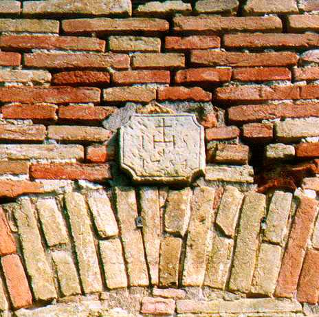Stemma del Papa Paolo V sul loggiato tamponato della Darsena Borghese di Fano, agosto 1998