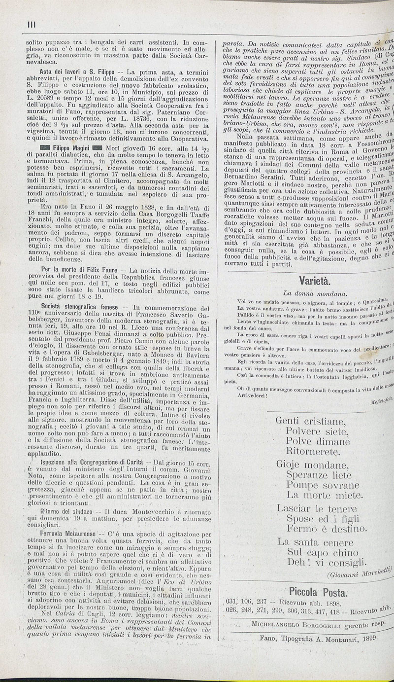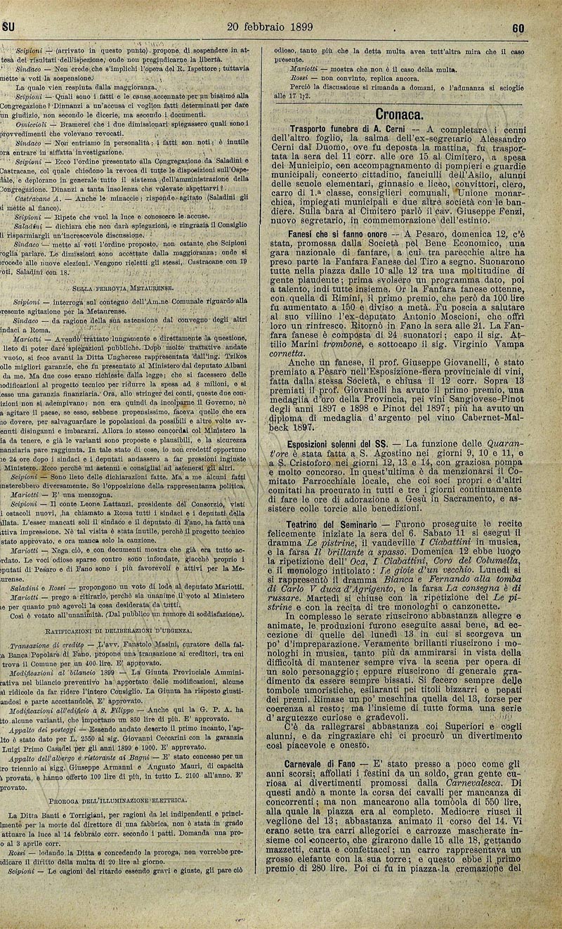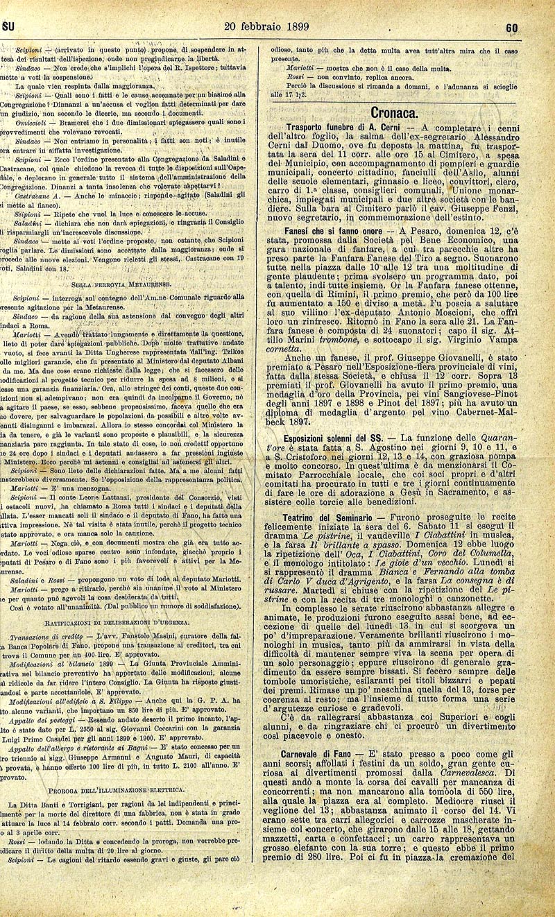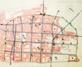Studio dell'assetto viario romano di Fanum sulla base della carta catastale del 1818 e dei ruderi ritrovati (da BATTISTELLI e DELI 1983). a - via Flaminia; b - Arco d'Augusto e decumano massimo; c - Porta delle mura della Mandria; d - cardo massimo (ipotizzato); e - Fortezza Malatestiana; f - Scuola Gandiglio; g - mura lungo via Garibaldi; h - piazza XX Settembre; i - corso Matteotti; l - S. Pier Vescovile; m - Cattedrale; n - isolato del S. Arcangelo. Rinvenimenti archeologici: 1 - via Montevecchio, mosaico; 2 - via Montevecchio, mosaico della pantera; 3 - via Montevecchio, reperti inesplorati; 4 - Duomo e via Rainerio; 5 - piazza XX Settembre; 6 - Palazzo Bambini e Cassa di Risparmio; 7 - piazza A. Costa; 8 - piazza Avveduti; 9 - Ist. Maestre Pie Venerini; 10 Politeama C. Rossi; 11 - piazza P.M. Amiani; 12 - via De Amicis; 13 - ex Seminario Vescovile, S. Agostino, ex arena Corso; 14 area ex Caserma Montevecchio; 15 - ex filanda Solazzi