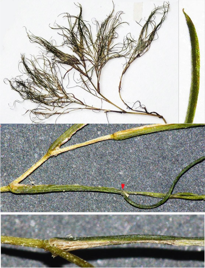 Stuckenia pectinata, acquitrino annesso al Lago Vicini in riva sinistra del Metauro a 1 km dalla foce, 10 ottobre 2020 (Erbario L. Poggiani); 2 - foglia con apice acuto; 3 - foglia con il punto segnato in rosso dove termina la sua parte guainante; in basso: base guainante avvolgente il fusto e del tutto aperta fino alla sua base, verde e con margine biancastro