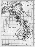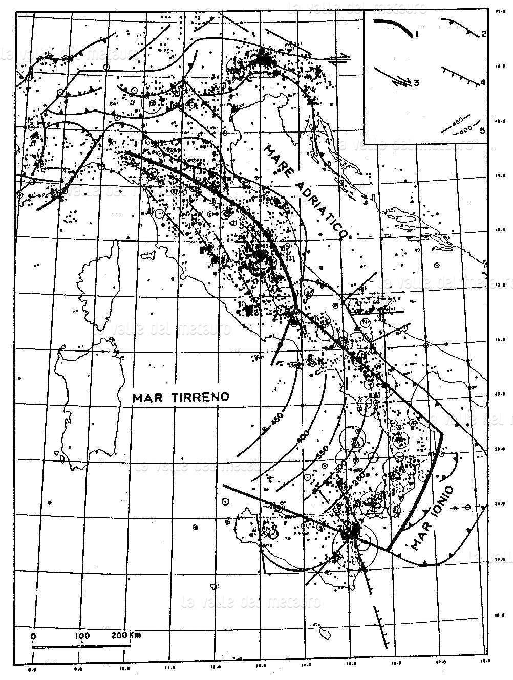 Strutture litosferiche, strutture principali di superficie e terremoti registrati lungo la penisola italiana negli ultimi 1000 anni (da Scandone et al., 1990). (1) asse di flessione della piastra di avampaese e strappi litosferici al margine degli archi appenninici; (2) sovrascorrimenti maggiori; (3) faglie per lo più a carattere trascorrente; (4) faglie normali; (5) zona di Wadati-Benioff del basso Tirreno (isobate in km).
