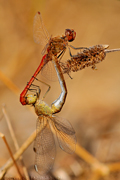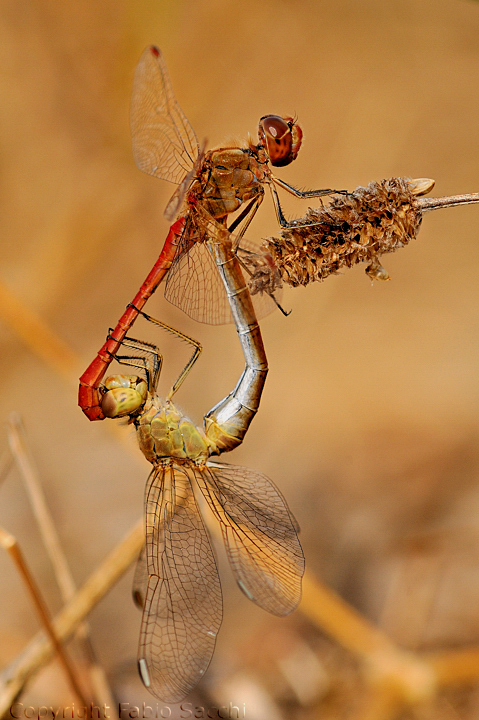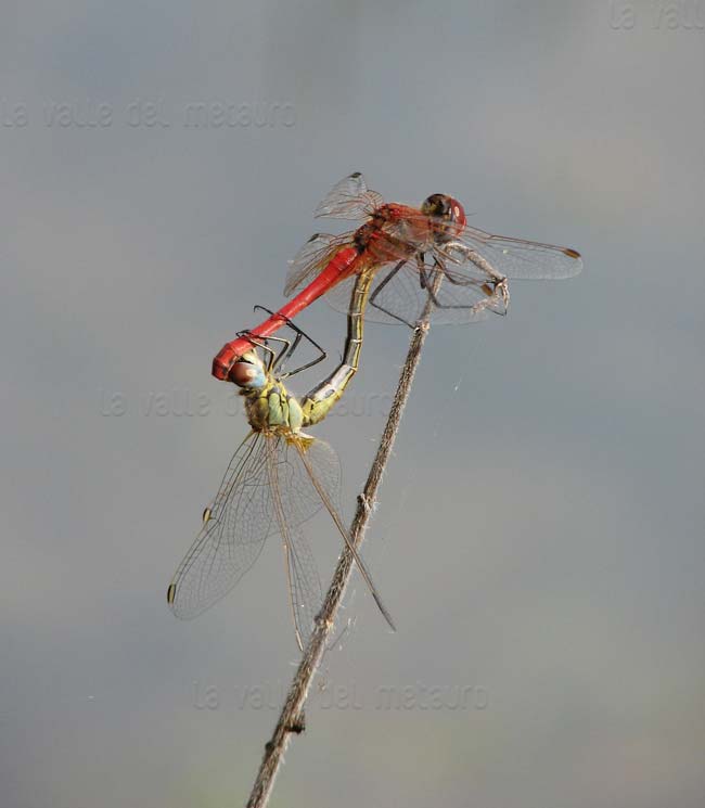 Sympetrum fonscolombii in accoppiamento: maschio di colore rosso e femmina verde-gialla, Stagno Urbani lungo il F. Metauro a Fano, settembre 2007