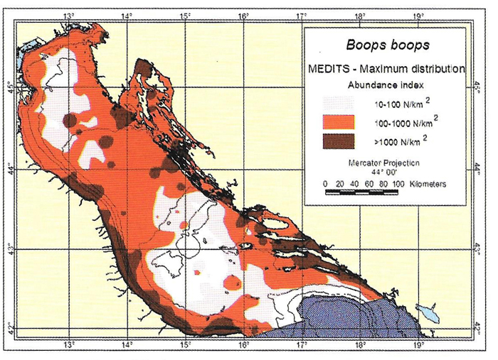 Boops boops, carta della massima distribuzione spaziale in adriatico, 1994-2009 (PICCINETTI et al. 2012)