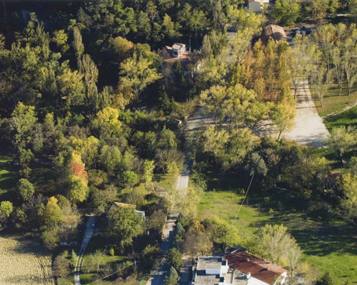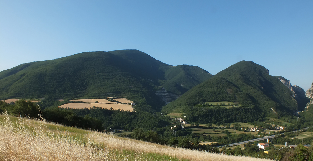 Terrazzi fluviali coltivati che spiccano tra il verde dei boschi sul fianco del M. Paganuccio, estremità di N.E. della Gola del Furlo, giugno 2012