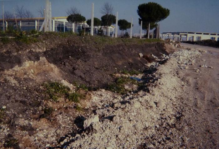 Terreno nero nella scarpata di scavo di una nuova strada nella zona industriale di Bellocchi, Villaggio della tarda Età del Bronzo a Chiaruccia di Fano, 25 dicembre 1980