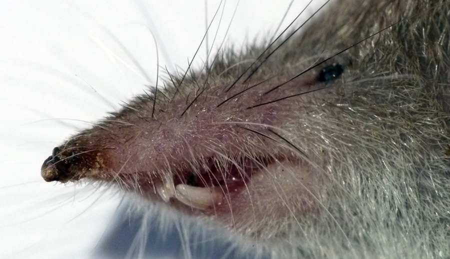 Testa di Crocidura suaveolens; lunghezza testa-corpo 58 mm, coda 33 mm, piede posteriore 11 mm. Gli incisivi hanno la punta bianca, Lago Vicini lungo il F. Metauro a Fano, maggio 2015