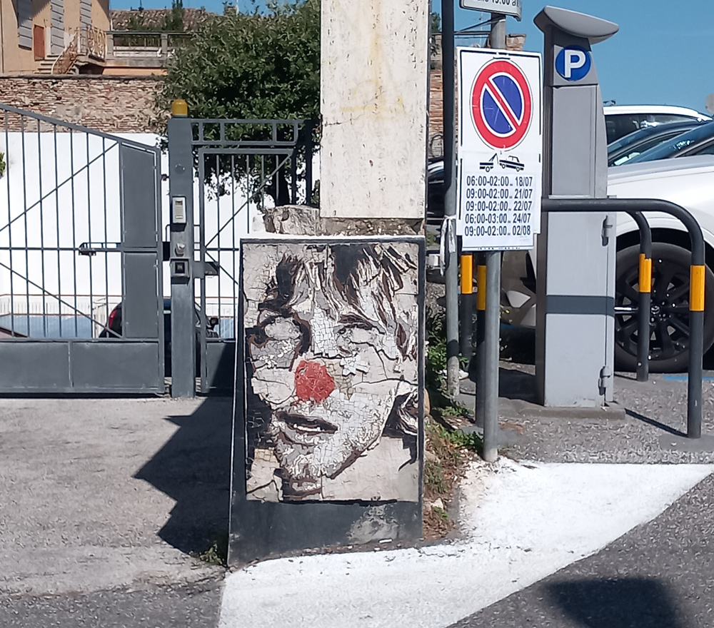 Testa di clown, mosaico in parte deteriorato, centro storico di Fano, luglio 2025