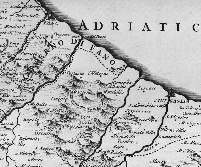 Territorio tra San Costanzo e Mondolfo, con Ciregia (Cerasa) e Stacciola. Carta della Legazione del Ducato di Urbino, F. Titi, 1697 (da BATTISTELLI e PANICALI 1979)