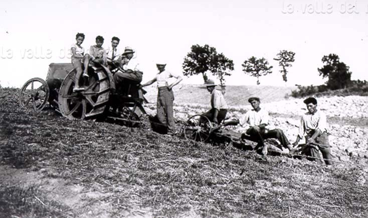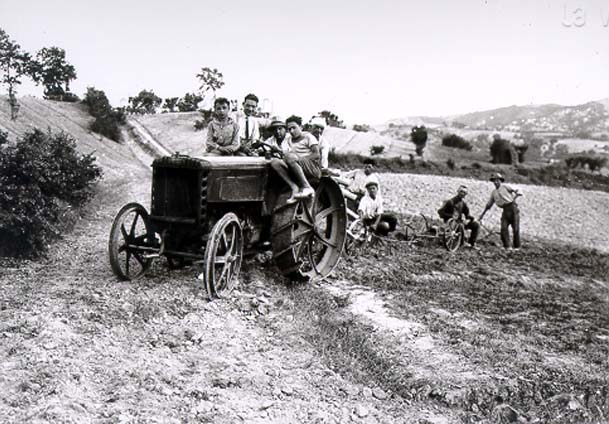 Tentativo di aratura meccanica con trattrice FIAT mod.702 ed aratri per buoi. Dintorni di Fossombrone, 1930-39 circa